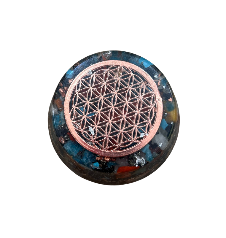 Dieser runde Orgonit mit der Blume des Lebens eignet sich ideal zur bewussten Harmonisierung deiner Räume. Durch seine kompakte, halbrunde Form wirkt er dezent und zugleich präsent – perfekt für Wohnbereiche, Schlafzimmer oder Arbeitsräume.